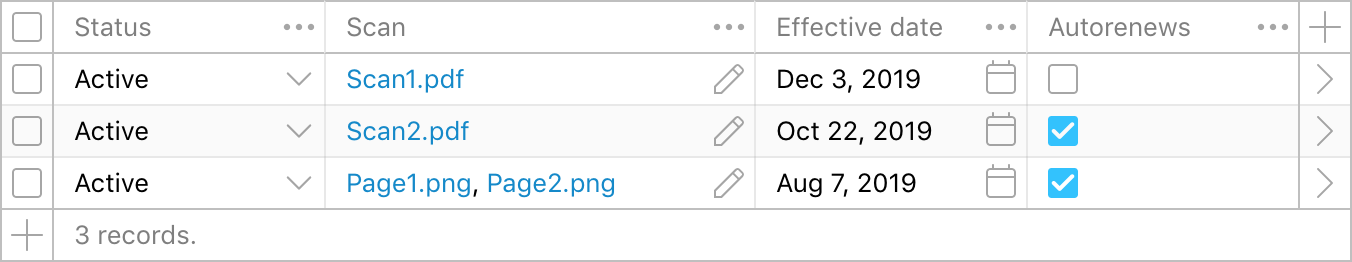 When you have a lot of files, it is sometimes useful to keep track of them by linking them to rows of a table. For example, a company that has a lot of scanned contracts might want to keep them organized in a database like this: